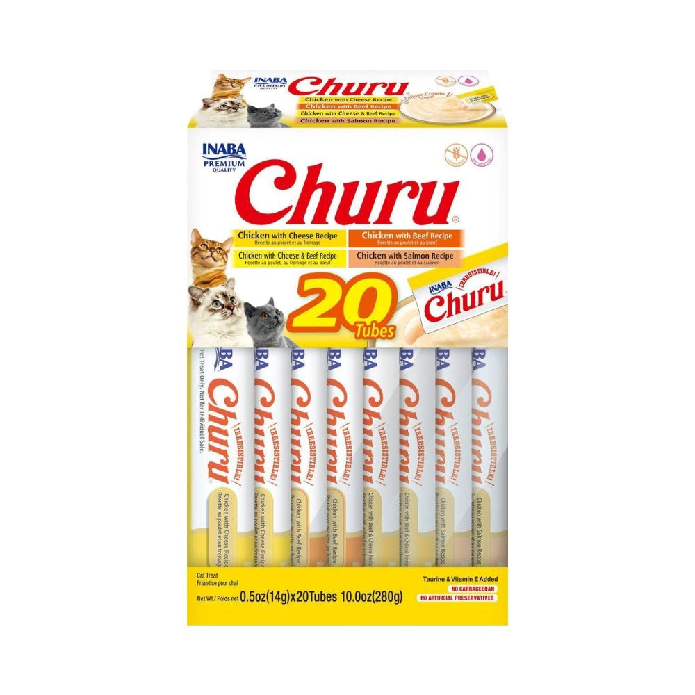 تشورو بنكهة الدجاج واللحم البقري في عبوات صغيرة، توفر تغذية متوازنة مع طعم شهي، مثالية للمكافآت اليومية للقطط.