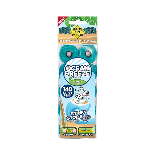 أكياس فضلات باقز أون بورد معطرة برائحة نسيم المحيط المنعشة، تساعد في تقليل الروائح الكريهة أثناء جمع فضلات الكلاب. تأتي العبوة بسعة 140 كيس سماوي، مصنوعة من مواد قوية ومقاومة للتمزق لضمان النظافة وسهولة الاستخدام أثناء التنزه.