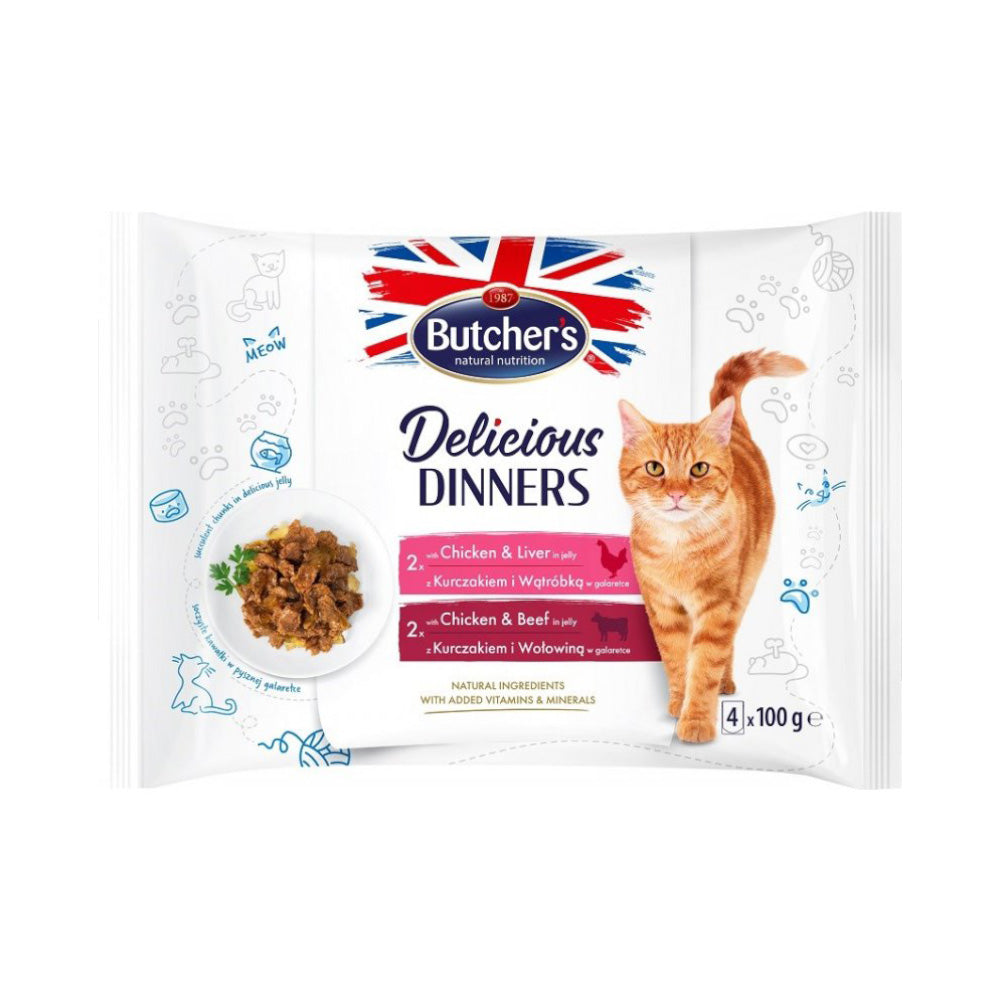 طعام رطب للقطط يحتوي على نكهات الدجاج الطازج مع مزيج اللحم البقري والكبد المغذي، بقطع طرية في جيلي يحافظ على نكهة وطزاجة الوجبة، يساعد في دعم صحة قطتك ويحفز شهيتها.