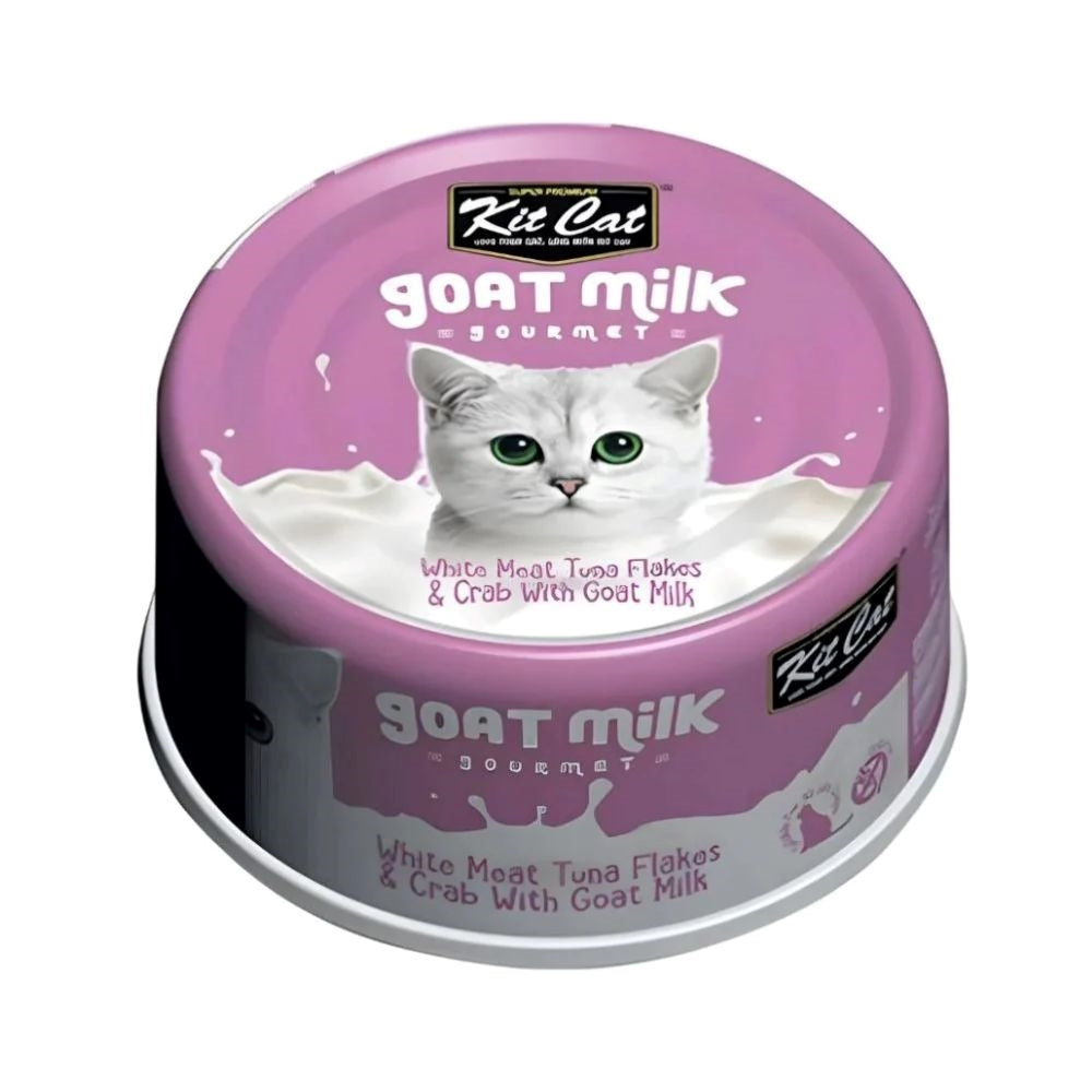 وجبة لذيذة من شرائح التونا والسلطعون مع حليب الماعز، توازن مثالي من البروتينات لدعم صحة قطتك.