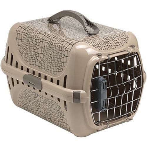 حامل تنقل مودرنا للقطط والكلاب الصغيرة، مزود بباب بلاستيكي قوي بلون بيج مع رسمة مميزة تضيف لمسة جمالية. خامات متينة وتصميم عملي يضمن أمان وراحة الحيوان أثناء التنقل.
