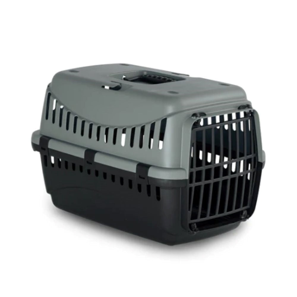 حامل تنقل صغير بلون رمادي من أم بي برغامو، مصنوع من خامات بلاستيكية متينة وخفيفة الوزن، مثالي لنقل قطتك الصغيرة بأمان وراحة.
