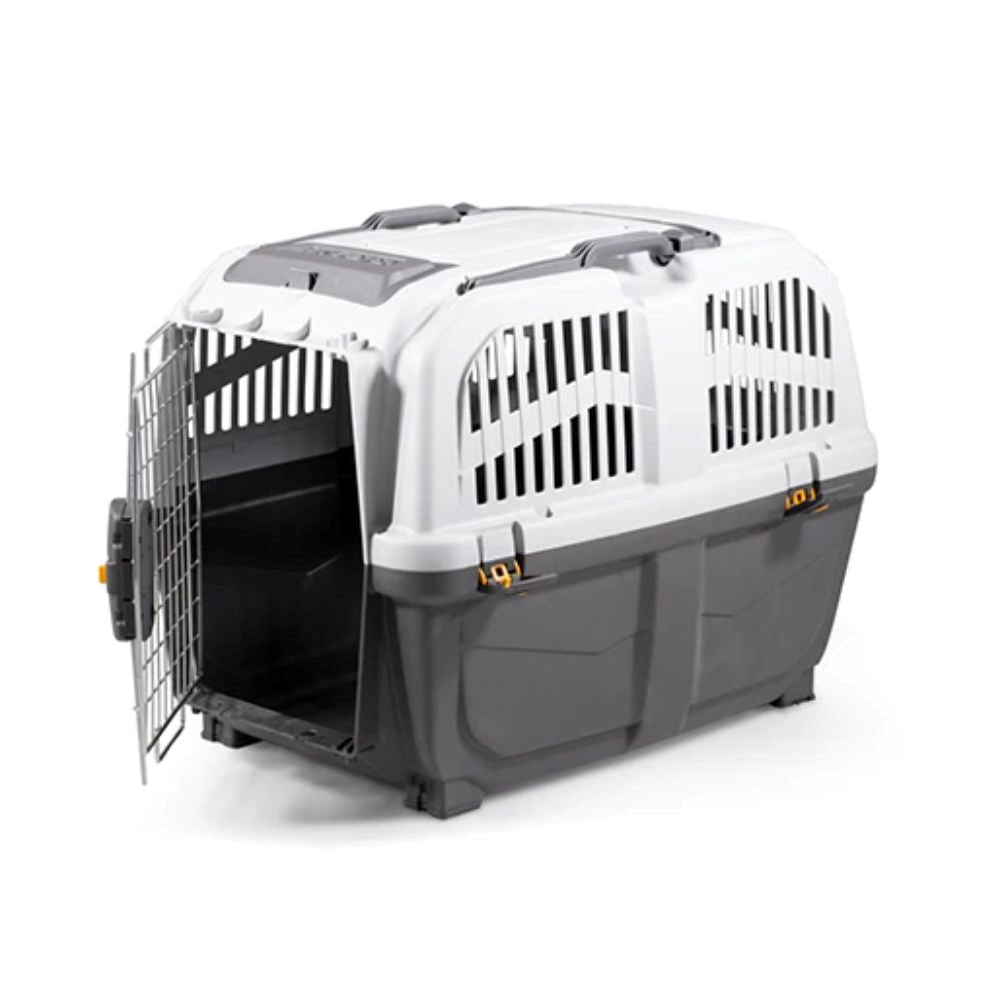 مل بلاستيك صغير مع باب حديدي متين، مناسب للقطط والكلاب الصغيرة، يضمن نقل آمن ومريح.