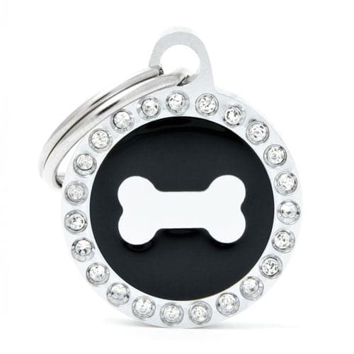 قلادة دائرية على شكل عظم باللون الأسود اللامع، تضيف لمسة أنيقة وعملية لطوق الحيوان مع خامات متينة وخفيفة الوزن.
