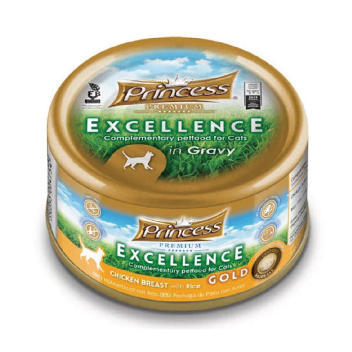 وجبة فاخرة من برنسيس بريميوم إكسلانس تحتوي على صدور الدجاج مع الأرز في تركيبة غنية ومغذية، مع طبقة جيلي طبيعية تعزز من الترطيب والطعم.