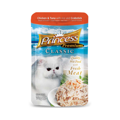 وجبة معلبة غنية تحتوي على مزيج الدجاج والتونة مع الأرز وسرطان البحر الطازج، تمنح قطتك نكهة فريدة وترطيب ممتاز مع مكونات صحية ومتوازنة.