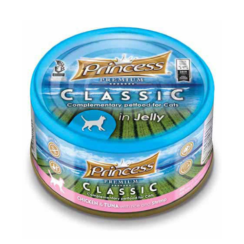 وجبة معلبة شهية ومتوازنة من برينسس بريميوم تحتوي على مزيج الدجاج والتونة مع الأرز والروبيان، تقدم لقطتك طعمًا غنيًا مع ترطيب ممتاز ومكونات مغذية.