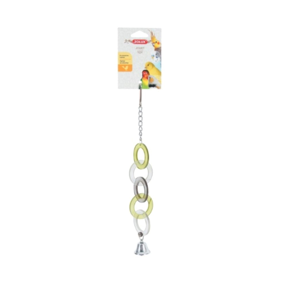 لعبة ترفيهية مميزة للطيور، تحتوي على حلقات ملونة مع جرس صغير، تساعد في تحفيز الحركة واللعب.