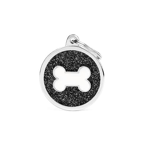 قلادة دائرية سوداء كبيرة مع نقش عظام بيضاء، تصميم فخم وجذاب للكلاب والقطط. خامات عالية الجودة ووزن خفيف.
