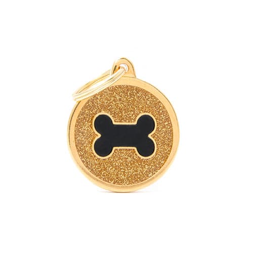قلادة دائرية كبيرة بلون أسود لامع مع نقش شكل عظمة، تصميم قوي وأنيق للكلاب الكبيرة. خامات متينة مع لمعة تحافظ على شكلها لفترة طويلة.