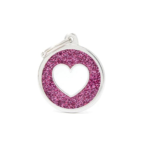 قلادة دائرية كبيرة بريق وردي مع تصميم قلب أبيض، تضيف لمسة أنثوية مميزة لطوق حيوانك. خامات مقاومة وخفيفة، تصاميمها تجمع بين الأناقة والعملية.