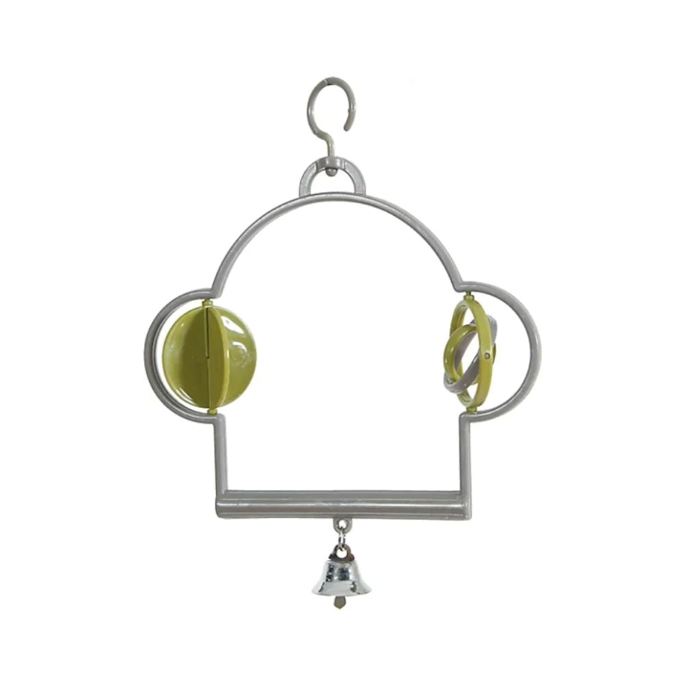 أرجوحة صغيرة مصنوعة من بلاستيك آمن، مزوّدة بلعبة ملونة تخلي الطير يتحرك ويتسلّى.