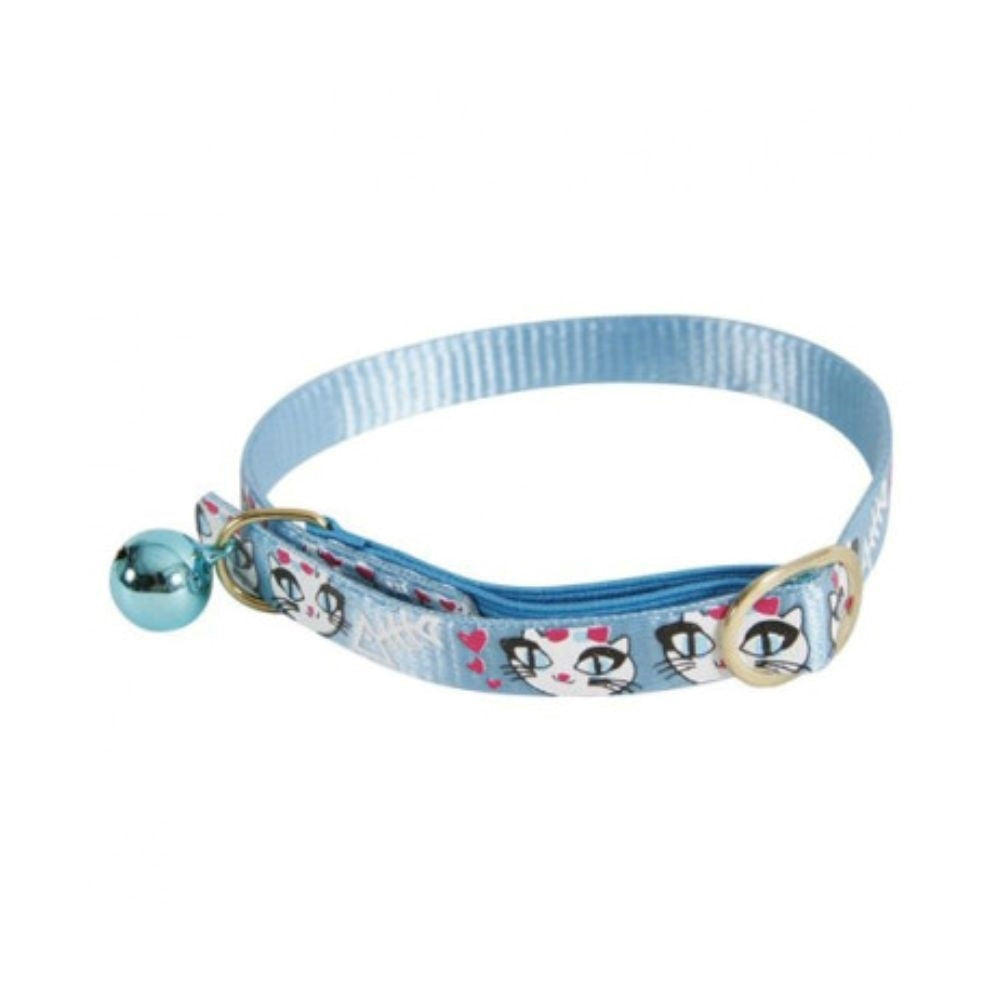 طوق ناعم وأنيق للقطط بلون أزرق ورسمة قطة ظريفة، مزوّد بجرس صغير وخفيف يساعدك تتابع قطتك في البيت.
