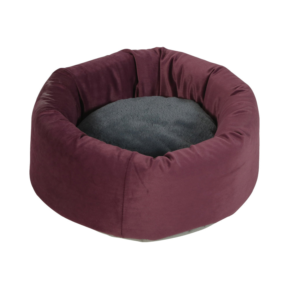 سرير دائري مريح بتصميم فاخر، بلون خمري جذاب، يناسب القطط والكلاب الصغيرة، مثالي للقيلولة والنوم العميق.