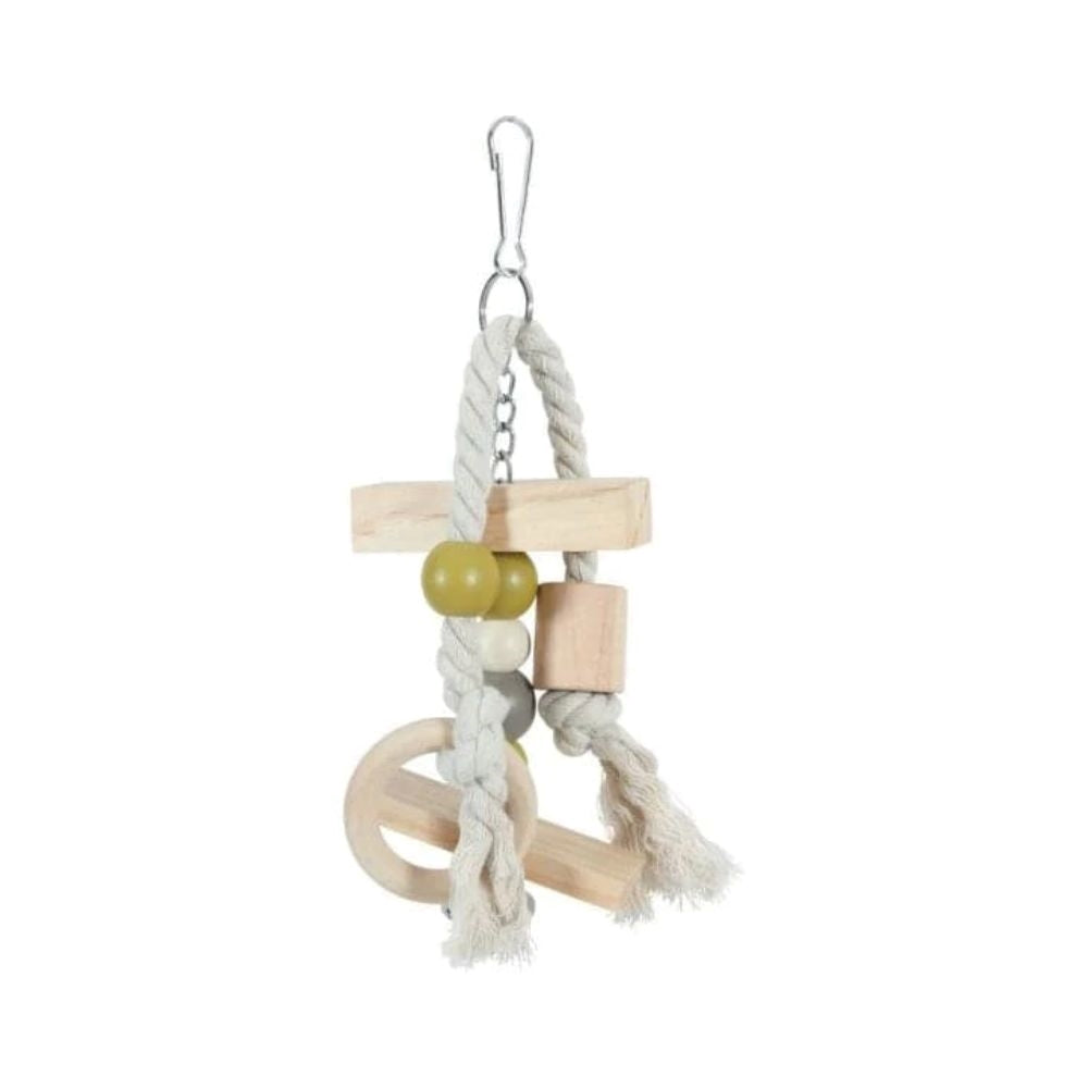 لعبة خشبية مميزة مزودة بجرس في الأسفل، تحفّز الطير على النقر والسحب وإصدار الأصوات. تعتبر من الألعاب اللي تثير فضول الطيور الكبيرة، وتخلّيها مشغولة طول اليوم. مثالية للطير اللي يحب يحرك الأشياء ويتفاعل مع الصوت.